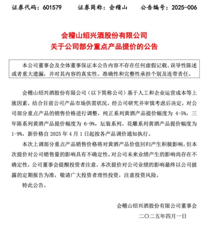 其中,純正系列黃酒產品提價幅度為 4-5%,三年陳系列黃酒產品提價幅度為 6-9%,壇裝系列、花雕系列黃酒產品提價幅度為 1-9%,新價格自 2025 年 4 月 1 日起按各產品調價通知執行。