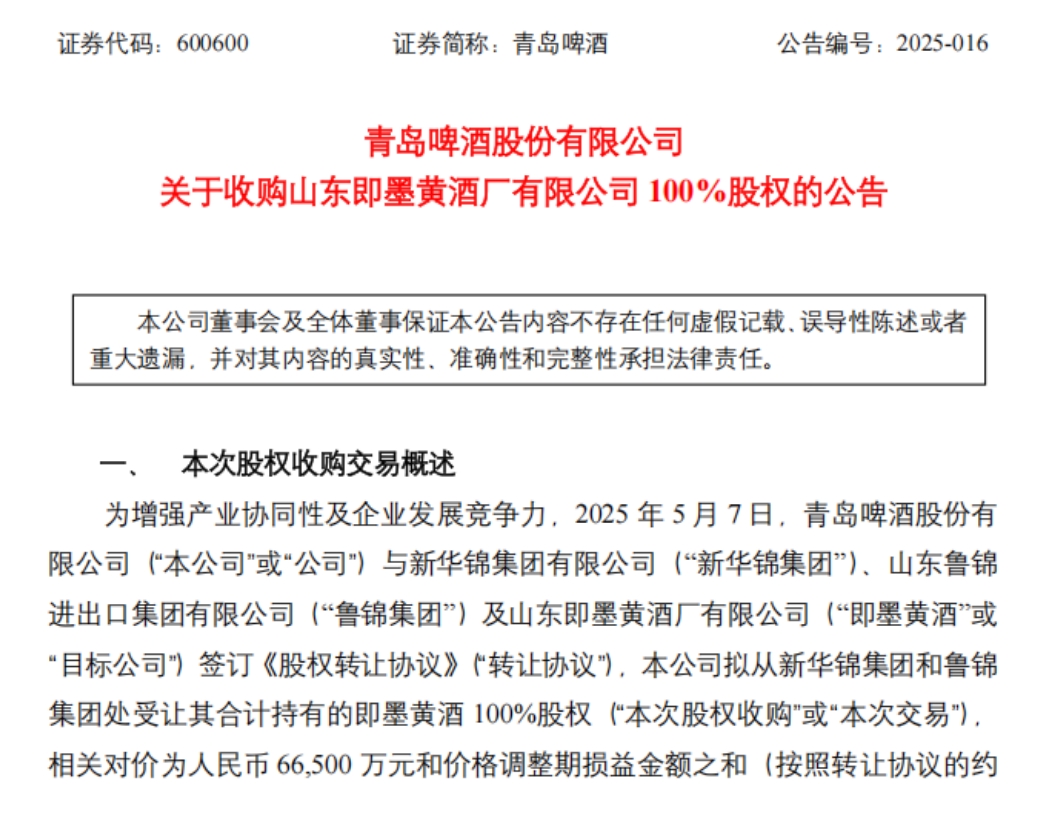為增強產業協同性及企業發展競爭力,2025年5月7日,青島啤酒股份有限公司(“本公司”或“公司”)與新華錦集團有限公司(“新華錦集團”)、山東魯錦進出口集團有限公司(“魯錦集團”)及山東即墨黃酒廠有限公司(“即墨黃酒”或“目標公司”)簽訂《股權轉讓協議》(“轉讓協議”),本公司擬從新華錦集團和魯錦集團處受讓其合計持有的即墨黃酒100%股權(“本次股權收購”或“本次交易”),相關對價為人民幣66,500萬元和價格調整期損益金額之和(按照轉讓協議的約定,“價格調整期損益”是指經審計的目標公司及其子公司在審計評估基準日凈資產扣除過渡期內目標公司向股東利潤分配的金額與經審計的交割日凈資產的差額)。本次股權收購交易完成交割后,本公司將持有即墨黃酒全部股權,即墨黃酒成為本公司的全資子公司,納入公司合并報表范圍。