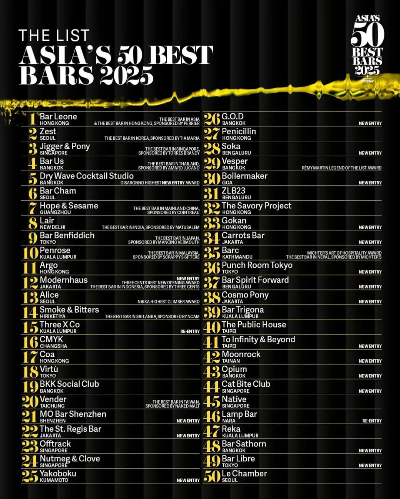 前三名與去年一致,第一名為中國香港的酒吧Bar Leone,首爾Zest榮獲第二名,第三名則是來自新加坡的Jigger & Pony,榜單有超過1/3新增酒吧!