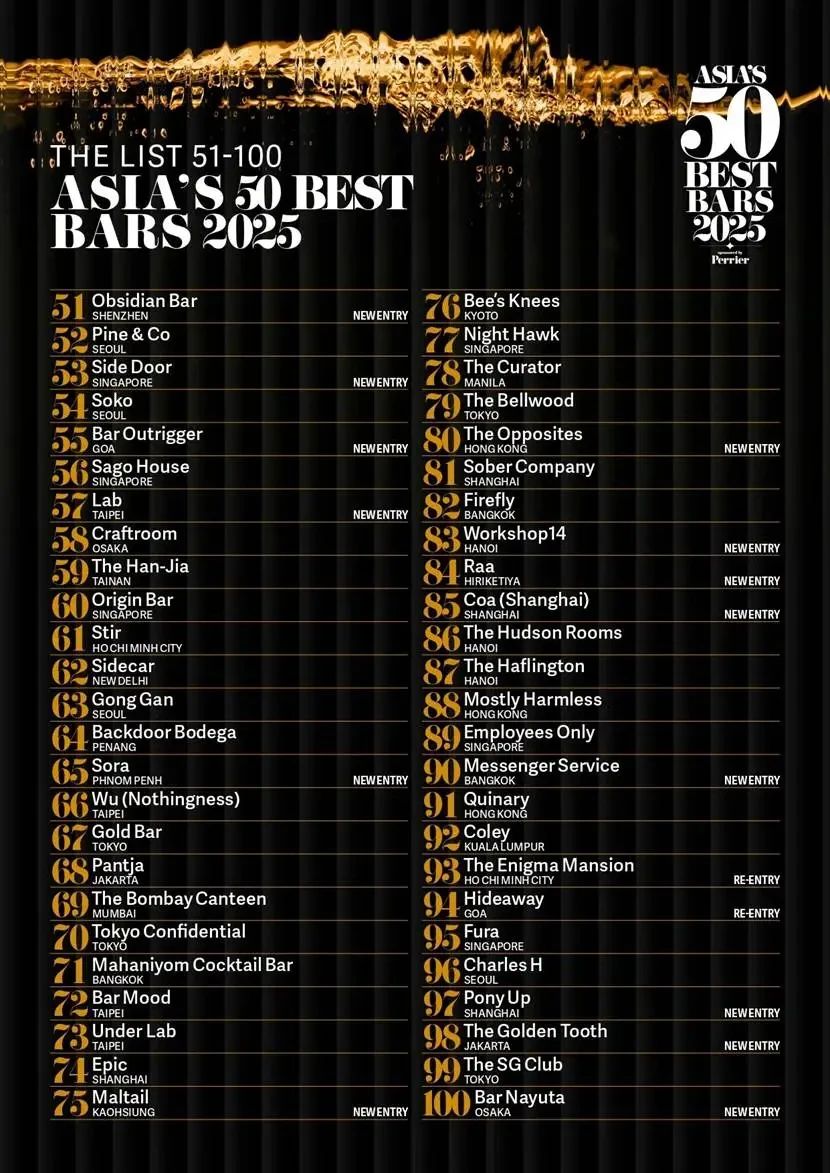 在此榜單發(fā)布之前,主辦方公布了第51-100擴(kuò)展榜單,其中,中國大陸及港澳臺(tái)地區(qū)共有14家酒吧上榜,內(nèi)地5家:深圳Obsidian Bar、上海Epic、上海Sober Company、上海Coa、上海Pony Up;臺(tái)灣地區(qū)6家:臺(tái)北Lab、臺(tái)北Wu、臺(tái)北Bar Mood、臺(tái)北Under Lab、臺(tái)南The Han-Jia、高雄Maltail;香港地區(qū)3家:The Opposites、Mostly Harmless、Quinary。
