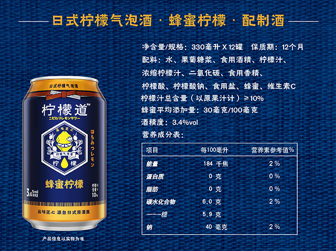 ????目前,檸檬道在中國(guó)大陸共推出了三種風(fēng)味,分別含有不同的酒精度與檸檬汁含量,消費(fèi)者可根據(jù)自身喜好進(jìn)行選擇。三種風(fēng)味分別是:蜂蜜檸檬口味(酒精度3.4%、檸檬汁總含量10%)、招牌檸檬口味(酒精度5.6%、檸檬汁總含量15%)以及鹽檸檬口味(酒精度7.5%、檸檬汁總含量10%)。該系列產(chǎn)品已于9月登陸電商渠道,并逐步覆蓋全國(guó)大賣場(chǎng)、超市和便利店等零售渠道。