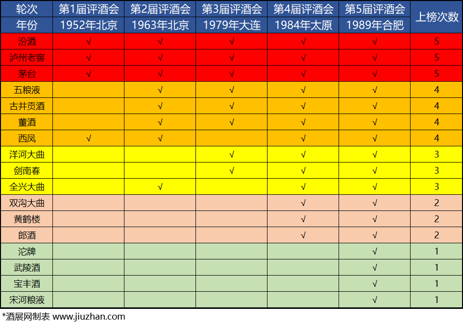 五次國家級評酒會中,哪些白酒品牌五次評酒會都上榜了