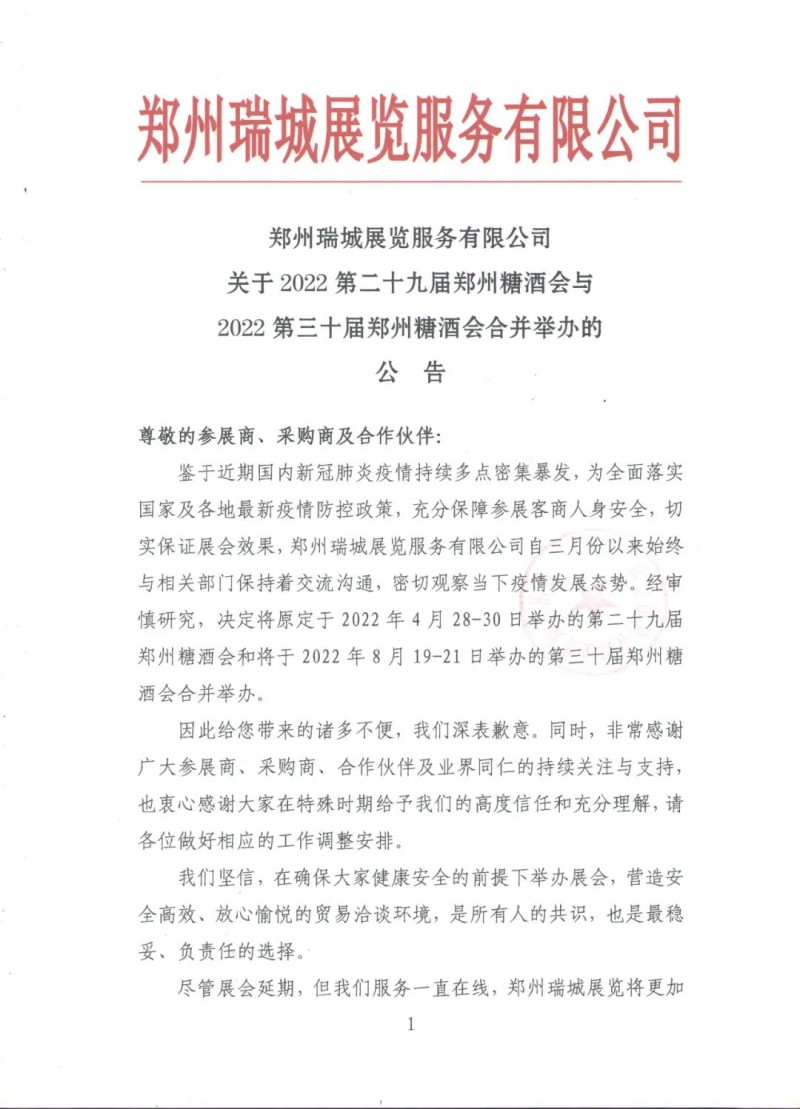鑒于近期國(guó)內(nèi)新冠肺炎疫情持續(xù)多點(diǎn)密集暴發(fā),為全面落實(shí)國(guó)家及各地最新疫情防控政策,充分保障參展客商人身安全,切實(shí)保證展會(huì)效果,鄭州瑞城展覽服務(wù)有限公司自三月份以來(lái)始終與相關(guān)部門保持著交流溝通,密切觀察當(dāng)下疫情發(fā)展態(tài)勢(shì)。經(jīng)審慎研究,決定將原定于2022年4月28-30日舉辦的第二十九屆鄭州糖酒會(huì)和將于2022年8月19-21日舉辦的第三十屆鄭州糖酒會(huì)合并舉辦。