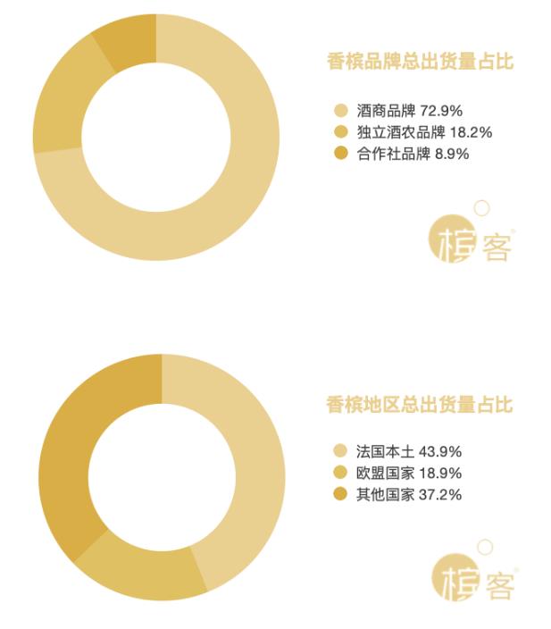 2021 年度,香檳全球總出貨量為 3.202 億瓶,較 2020 年上漲 31.18%,較疫情前的 2019 年上漲 7.7%,其中酒商品牌占 72.9%,獨立酒農品牌占 18.2%,合作社品牌占 8.9%;法國本土占 43.9%,歐盟國家占 18.9%,其他國家占 37.2%。