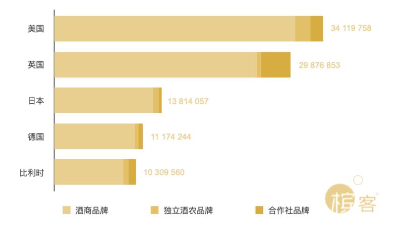 按總出貨量統計,2021 年全球前五大香檳市場依次為美國、英國、日本、德國和比利時,美國超過英國位居第一。(單位:瓶)