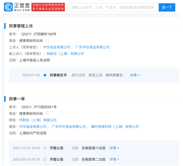 近日,企查查APP顯示,特斯拉(上海)有限公司新增一條侵害商標權糾紛開庭公告。