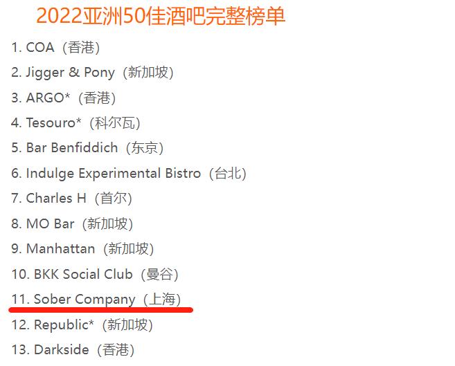 其中,位于上海雁蕩路99號的Sober Company酒吧,獲得總榜單排名第11的好成績,同時也是中國大陸排名第一的酒吧。其實從2017年開業(yè)至今,Sober Company 連續(xù)6年入圍亞洲50佳酒吧榜單,連續(xù)3年入圍全球50佳酒吧榜單,曾摘下“世界最佳餐廳酒吧”稱號,并保持著“中國大陸最佳酒吧”的頭銜……