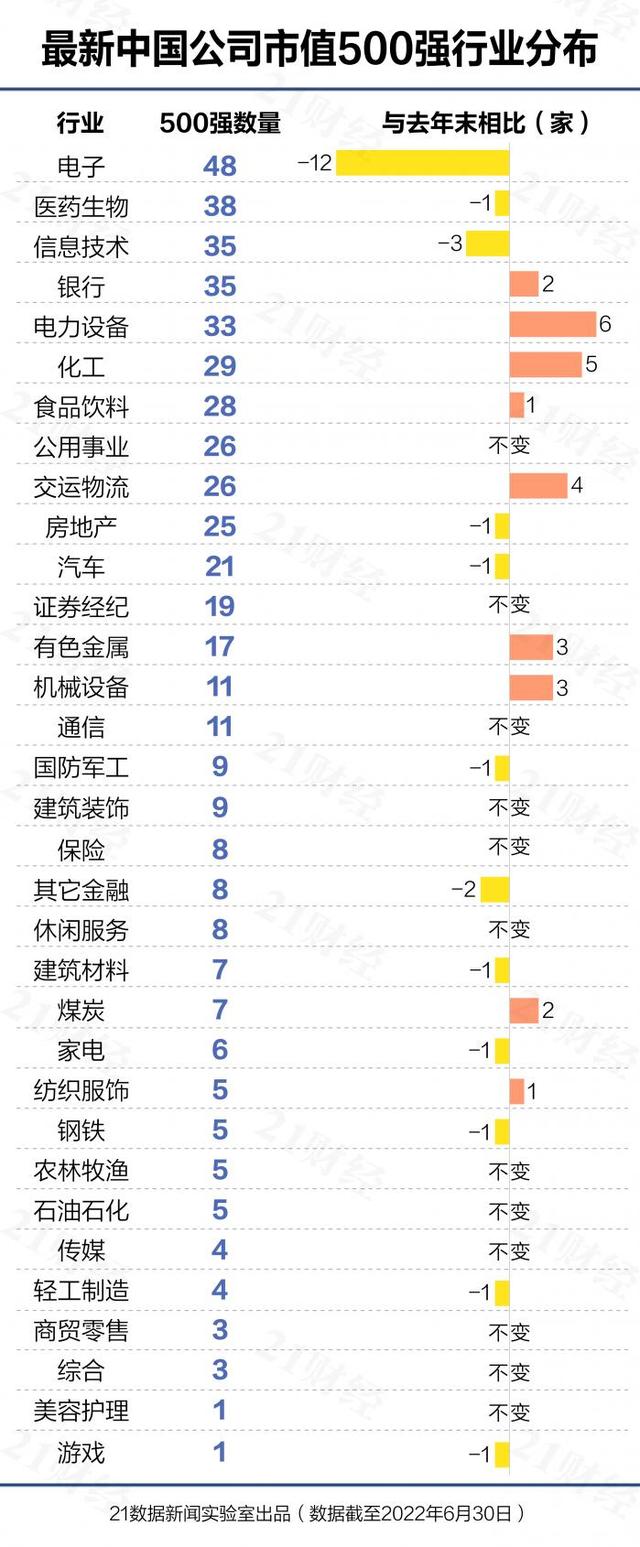 近日,21數(shù)據(jù)新聞實(shí)驗(yàn)室發(fā)布了中國(guó)上市公司市值500強(qiáng)名單。據(jù)統(tǒng)計(jì),截至2022年6月30日,在上海、深圳、北京、香港、紐約等全球16個(gè)主要交易所上市的中國(guó)上市公司共計(jì)8392家(剔除已退市公司),相比去年年末增加116家??偸兄?30.22萬(wàn)億元(人民幣,下同),相比去年年末降低8%。