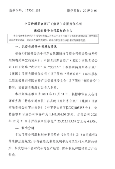 公告顯示,本次劃轉基準日為2021年12月31日,劃轉基準日習酒公司凈資產為114.16億元,占茅臺集團2021年12月31日合并報表口徑凈資產2352億元的4.85%。