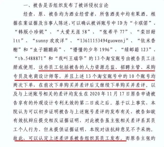 最終法院認定這些留言差評的賬號中,有13個淘寶賬號由醉鵝娘員工注冊或使用的。并且這13個淘寶賬號中的10個賬號均兩次下單,在前次下單購買并差評后又繼續下單購買并差評。與上述賬號相關的差評均發生在2020年11月17日落飲公司申請醉鵝娘公司享有的外觀設計專利無效的第二天或之后。