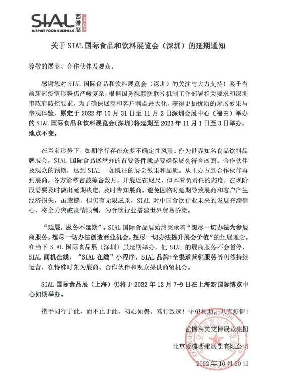 感謝您對SIAL國際食品和飲料展覽會(深圳)的關注與大力支持!鑒于當前新冠疫情形勢仍嚴峻復雜,根據國務院聯防聯控機制工作部署相關要求和深圳市政府防控要求,為了確保展商和客戶利益最大化,獲得更加優質的參展效果與參觀體驗,原定于2022年10月31日至11月2日深圳會展中心(福田)舉辦的SIAL國際食品和飲料展覽會(深圳)將延期至2023年11月1日至3日舉辦,地點不變。