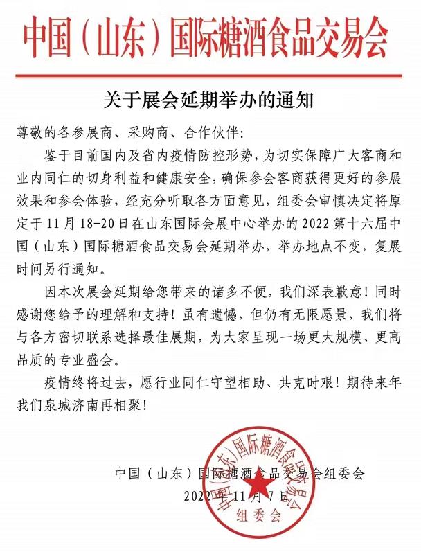 鑒于目前國內及省內疫情防控形勢,為切實保障廣大客商和業內同仁的切身利益和健康安全,確保參會客商獲得更好的參展效果和參會體驗,經充分聽取各方面意見,組委會審慎決定將原定于11月18-20日在山東國際會展中心舉辦的2022第十六屆中國(山東)國際糖酒食品交易會延期舉辦,舉辦地點不變,復展時間另行通知。