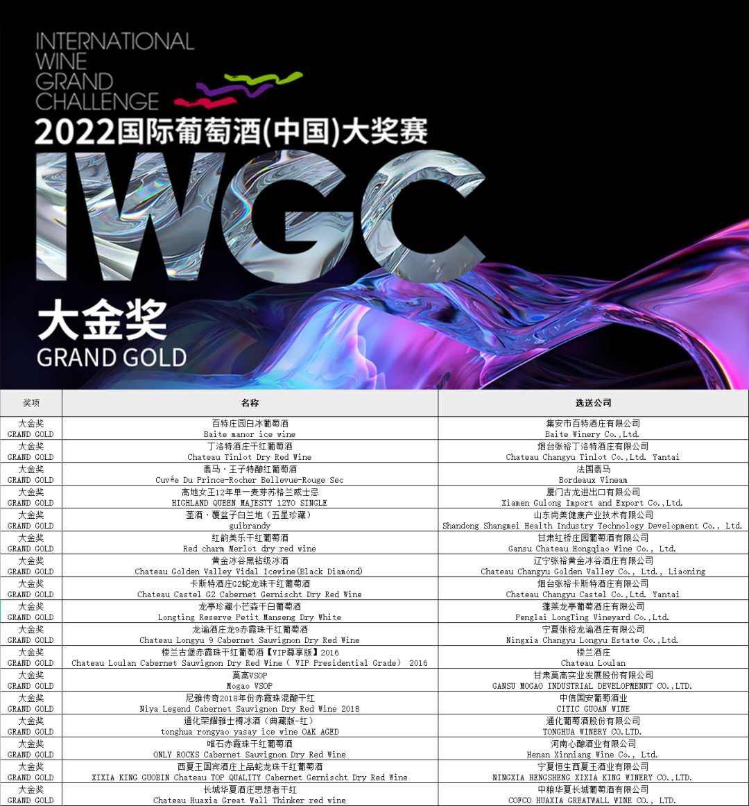 2022國際葡萄酒(中國)大獎賽(IWGC)完整榜單(排名不分先后):