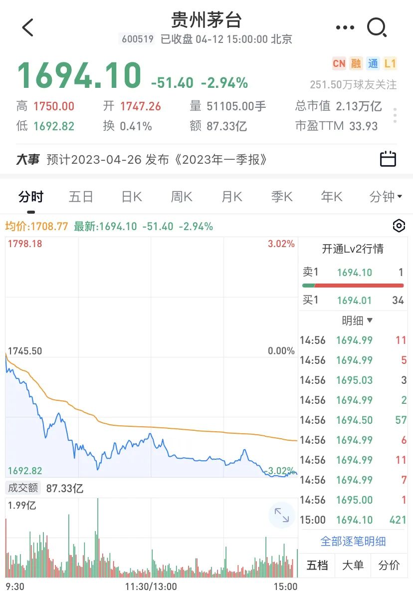 4月12日,大消費板塊盤中持續(xù)走弱,白酒、食品飲料方向領跌。貴州茅臺開盤后放量下挫,盤中最多跌逾3%,股價一度跌破1700元整數(shù)位,創(chuàng)年內新低。