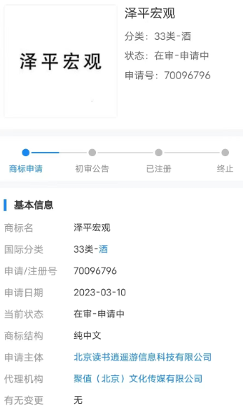 記者查詢商標注冊信息顯示,“澤平宏觀”白酒商標申請狀態為“在審”,申請日期為2023年3月10日,未獲得正式商品注冊。“澤平宏觀”白酒商標申請主體為北京讀書逍遙信息科技有限公司,該公司工商信息登記信息顯示其法人代表為任澤平。