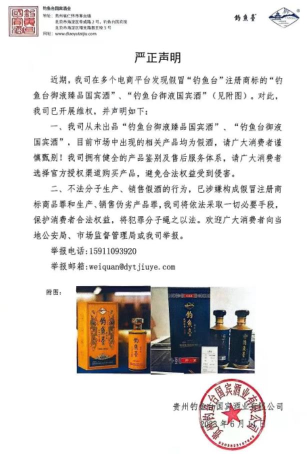 6月14日,釣魚臺發布維權嚴正聲明稱,近期,我司(指釣魚臺,下同)在多個電商平臺發現假冒“釣魚臺”注冊商標的“釣魚臺御液臻品國賓酒”、“釣魚臺御液國賓酒”。對此,開展維權,并聲明如下: