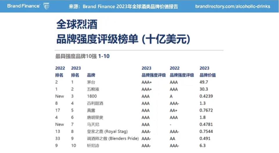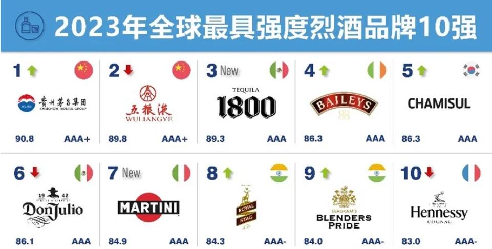 針對烈酒品牌,榜單還排出了“最具強度烈酒品牌十強”,其中茅臺、五糧液排在最具強度烈酒品牌前兩名,也是前十名中唯二的兩家中國白酒品牌。茅臺超過了五糧液(品牌價值上升5%,達到303億美元),成為排行榜上最強的品牌。目前,茅臺的品牌實力指數(BSI)為90.8分(滿分100分),相應的品牌評級為AAA+。五糧液緊隨其后,BSI高達89.8(滿分100)。根據這一評分,五糧液的品牌強度評級也被提升為AAA+級。