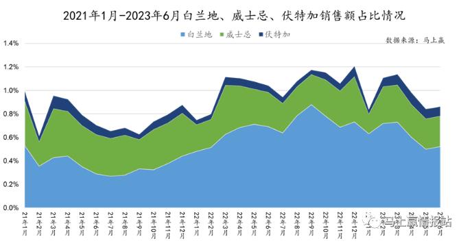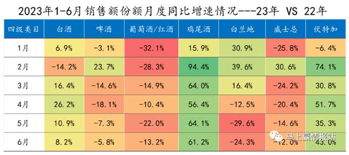 三個梯隊中,洋酒梯隊的銷售額占比雖然最小但其占比增速不容小覷。進一步觀察其內部占比數據可以發現,銷售額占比最高的白蘭地對該梯隊總體占比的變動影響較大;威士忌雖銷售額占比增速為負但仍有一定的市場份額;而伏特加目前的市場份額雖然微不足道,但可以期待其在30%的增速下有更加亮眼的市場成績。在此基礎上,洋酒梯隊總體銷售額占比呈現出提升趨勢,結合第二梯隊占比的下降趨勢來看,洋酒在中國市場中的提升空間值得期待。