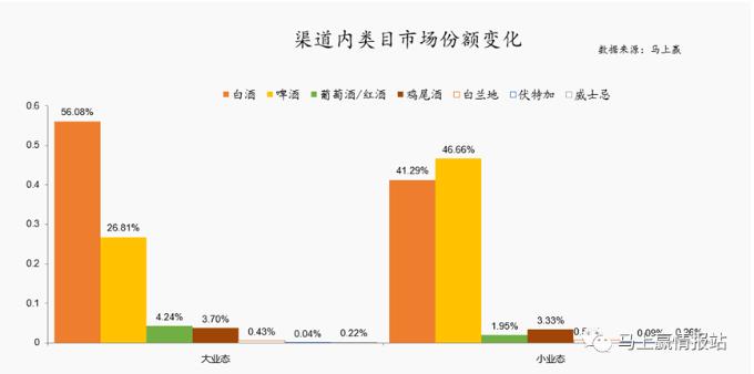 從渠道內類目市場份額來看,不管在大業態(大賣場和超市)、小業態(食雜店、便利店和小超市),白酒和啤酒占比具有絕對優勢;而白蘭地、伏特加、威士忌在小業態的市場份額相對較高,便利店調酒、家庭小酒館的興起,促進小業態中小規格烈酒的普及,同時也降低了烈酒消費門檻。