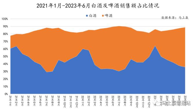 作為市場規模最大的白酒、啤酒,其整體銷售額占比的波動也是三個梯隊中最為顯著的,但二者相加基本保持在80%-90%的區間內。與此同時,第一梯隊內部的銷售額占比變動也相對較大,白酒與啤酒在2021年7-8月、2022年4-7月以及2023年1月受季節、節日等因素影響,均經歷了明顯的此消彼長。但就整體而言,白酒的市場份額略高于啤酒,二者的消費高峰期均會帶動第一梯隊總體市場份額的上漲。