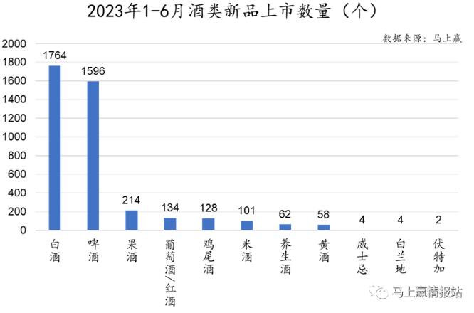 正如里斯戰略定位咨詢全球CEO張云所說,目前在中國酒類市場中白酒仍占據顯著優勢,這一結論在2023年1-6月酒類新品上市數量的對比之中也能夠得到印證。數據顯示,2023年1-6月白酒上市的新品數量高達1764個,約為位列第三的果酒新品數量的八倍;啤酒作為中國餐飲、居家等眾多消費場景的熱門選擇,以1596個新品數量穩居第二;而威士忌、白蘭地、伏特加等經典西方烈酒新品上市數量則僅有個位數,明顯偏少。