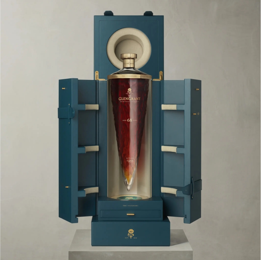 排名第三的是The Glen Grant The Visionary,蒸餾于1955年,熟成于Oloroso雪莉桶(Oloroso Sherry Butt),裝瓶于2023年,酒齡為68年,酒精度數(shù)為49.2% ABV,容量為1.5升,并且僅裝了1瓶,得拍者還將獲得一次參觀格蘭冠酒廠的機(jī)會(huì)。這瓶酒預(yù)估成交價(jià)為5至9萬英鎊,最終成交價(jià)為21.25萬英鎊(含傭金),按現(xiàn)行匯率計(jì)算,約合188.45萬元人民幣。