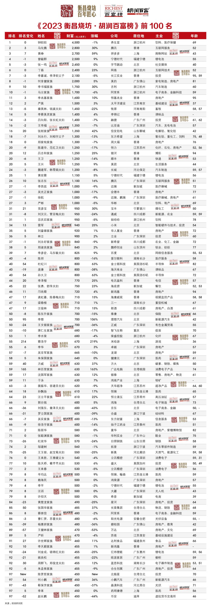 附:《2023衡昌燒坊·胡潤百富榜》前100名