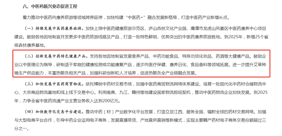 (二)創新發展中藥特色健康產品。支持各地因地制宜發展食養產品、中藥功能食品、特殊功效化妝品、藥酒等大健康產品。鼓勵企業以中醫理論為指導,研制適于家庭的健康檢測或功能康復產品,逐步向醫療保健、康養日化、食品香料等領域拓展。進一步提升艾草種植生產供應能力,豐富熱敏灸相關產品,加強科研創新和人才培養,促進熱敏灸全產業鏈融合發展。