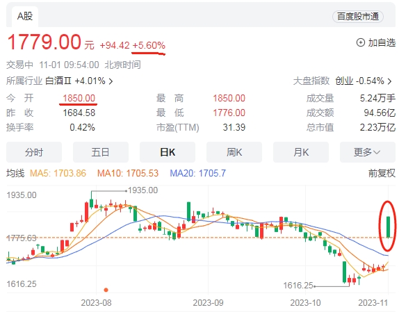受茅臺漲價利好消息影響,11月1日A股開盤,貴州茅臺(代碼600519)以接近漲停價1850元/股開盤,之后回落至漲幅6%附近。受茅臺股價上漲行情帶動,整個白酒概念板塊高開3%,伊力特、大湖股份、五糧液、瀘州老窖等股票跟漲。