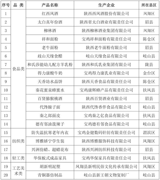 本次入選的陜西寶雞名優(yōu)產(chǎn)品名單如下: