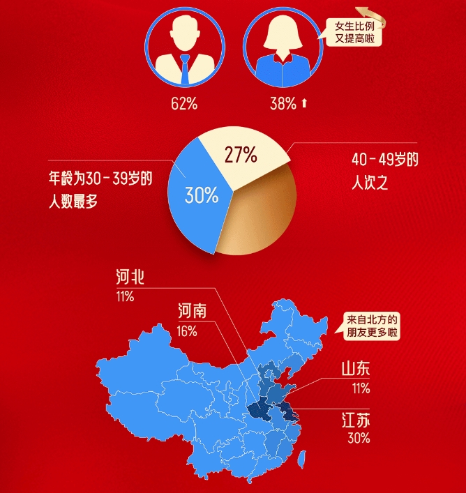 分性別看,女性會員占比提高至38%;男性占比62%;分年齡看,30-39歲年齡段會員占比最多,為30%,40-49歲年齡段次之,占比27%;分地域看,江蘇、河南、山東、河北占比最高,分別為30%、16%、11%、11%,主要集中在華東地區。