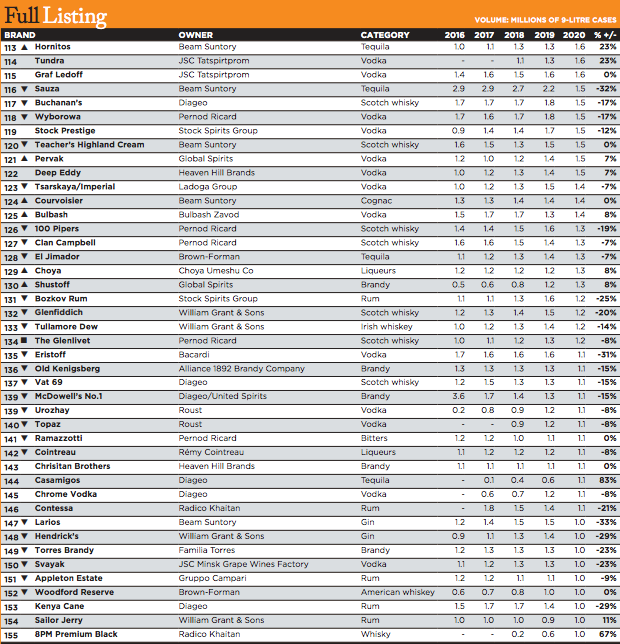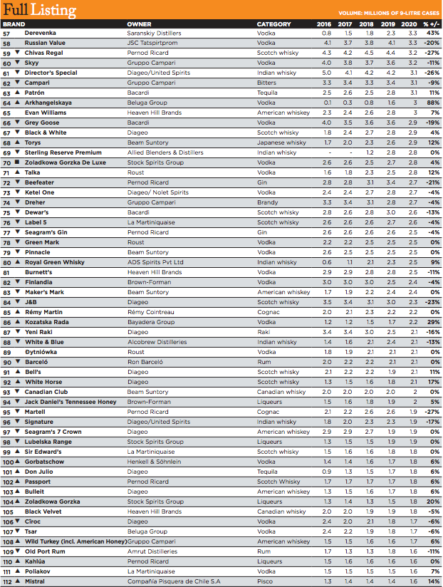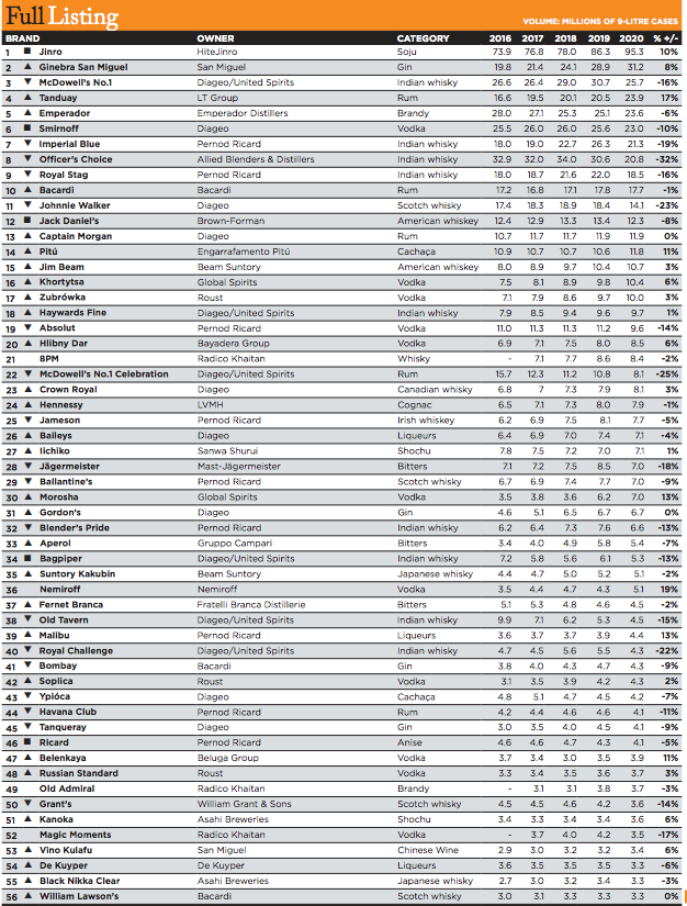 本次世界烈酒銷量排名報告The Millionaires’ Club完整榜單如下: