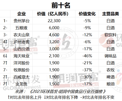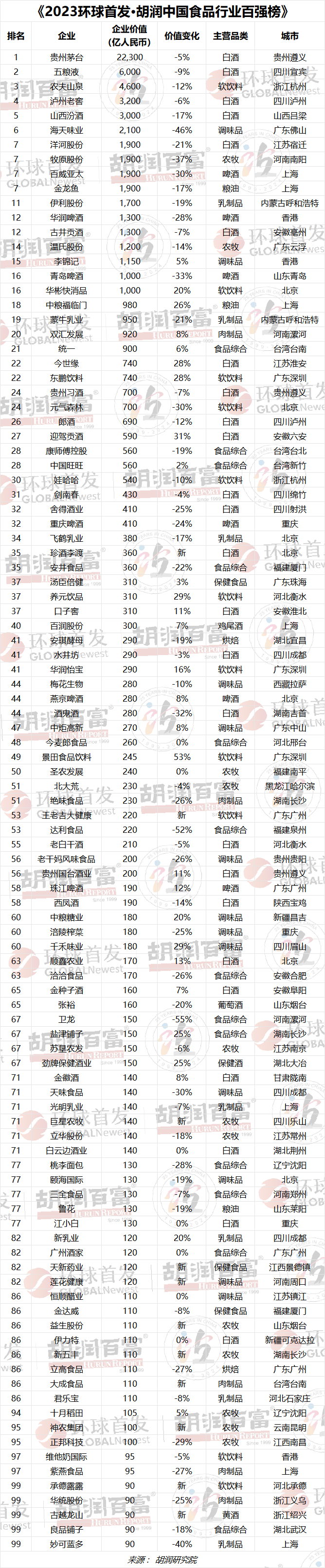 《2023環球首發·胡潤中國食品行業百強榜》完整榜單