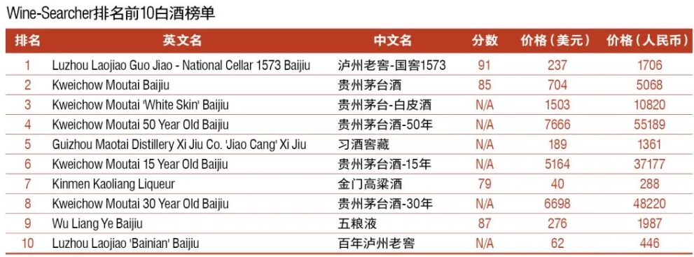 近日,葡萄酒搜索平臺(tái) Wine-Searcher根據(jù)數(shù)據(jù)庫(kù)最新的數(shù)據(jù),統(tǒng)計(jì)出了一份世界上最受歡迎的前十名白酒榜單。在這份榜單上,國(guó)窖1573排名最高,根據(jù) Wine-Searcher 的統(tǒng)計(jì),在目前全世界最受歡迎的酒精飲料排名中,這款白酒位居第65位。,貴州茅臺(tái)雖然幫上有名,但并非在榜首位置。五糧液雖然在國(guó)內(nèi)非常知名,但卻是在今年才登上Top 10榜單。