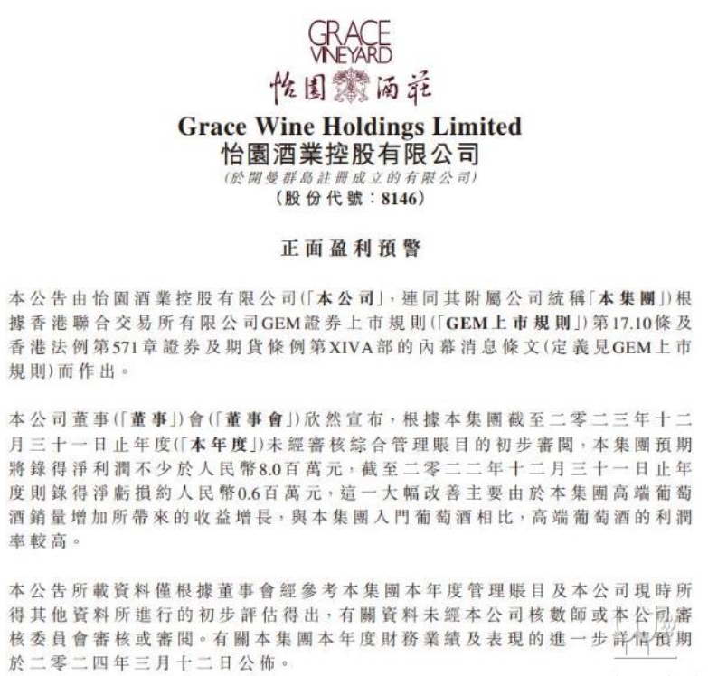 近日,怡園酒業(yè)發(fā)布公告稱,根據(jù)集團截至 2023 年 12 月 31 日止年度未經(jīng)審核綜合管理賬目的初步審閱,集團預(yù)期將錄得凈利潤不少于人民幣 800 萬元;截至 2022 年 12 月 31 日止年度錄得凈虧損約人民幣 60 萬元。