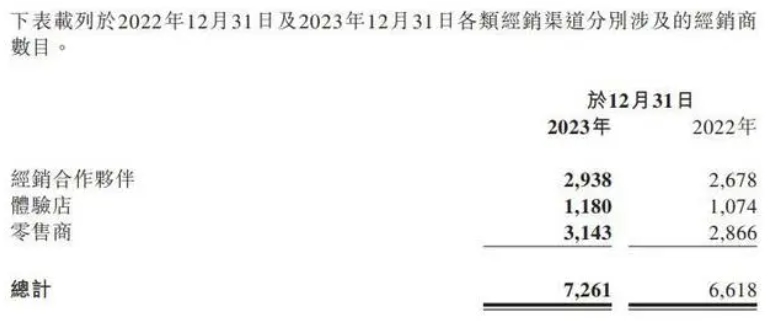 去年,公司經(jīng)銷商數(shù)量從上一年的6618家增加值7261家。其中,截至2023年12月31日,經(jīng)銷合作伙伴2938家,體驗(yàn)店1180家,零售商3143家。