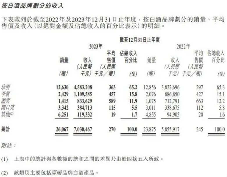 2023年,珍酒李渡實(shí)現(xiàn)營(yíng)業(yè)收入70.3億元,同比增長(zhǎng)20.1%;經(jīng)調(diào)整凈利潤(rùn)16.23億元,同比增長(zhǎng)35.5%。旗下珍酒、李渡、湘窖、開(kāi)口笑品牌,營(yíng)業(yè)收入分別為45.83億元、11.09億元、8.33億元、3.84億元,同比增長(zhǎng)19.9%、25.1%、17.0%、13.6%。珍酒李渡在財(cái)報(bào)中表示,按2023年收入計(jì),珍酒為中國(guó)第四大醬香型白酒品牌,且珍酒貢獻(xiàn)了珍酒李渡約65.2%的收入。