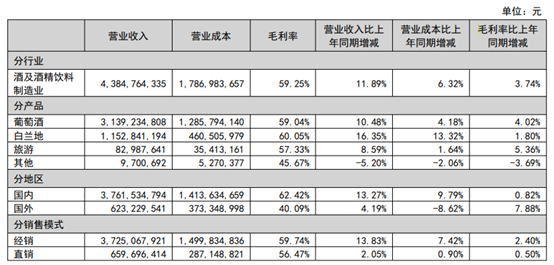 2023年,張裕的葡萄酒實現營業收入約31.39億元,占總營收的71.59%,葡萄酒的毛利率為59.04%,同比增長4.02%。