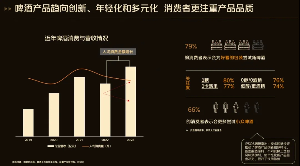 啤酒個性化消費(fèi)需求崛起。更高的麥芽濃度、口感更清淡爽口、包裝更美觀等因素,是吸引消費(fèi)者的主要原因。
