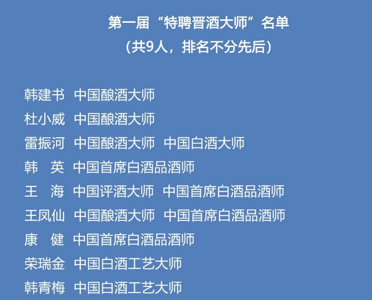 11月25日,山西省食品工業協會發布關于第一屆“晉酒大師”評價結果的公示。評選出“晉酒大師”“特聘晉酒大師”各9人,公示期為3個工作日,具體名單如下圖。