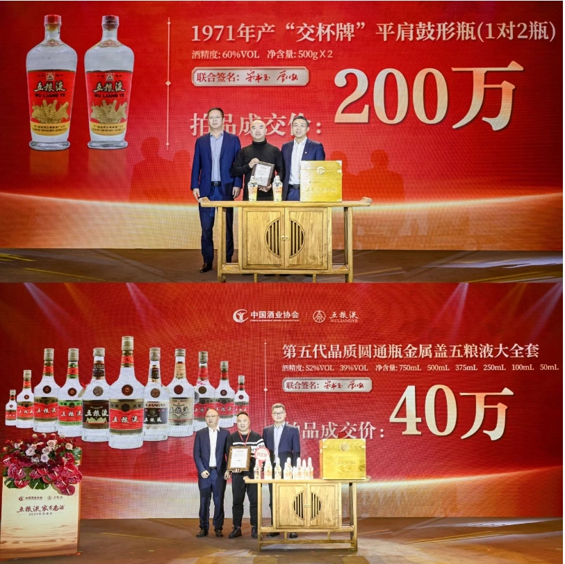 在活動現(xiàn)場,兩套由中國酒業(yè)協(xié)會理事長宋書玉、五糧液集團(tuán)(股份)公司黨委書記、董事長曾從欽親筆簽名的珍稀陳年五糧液分別拍出了40萬元與200萬元的價格,體現(xiàn)了收藏市場對陳年五糧液價值的高度認(rèn)可。