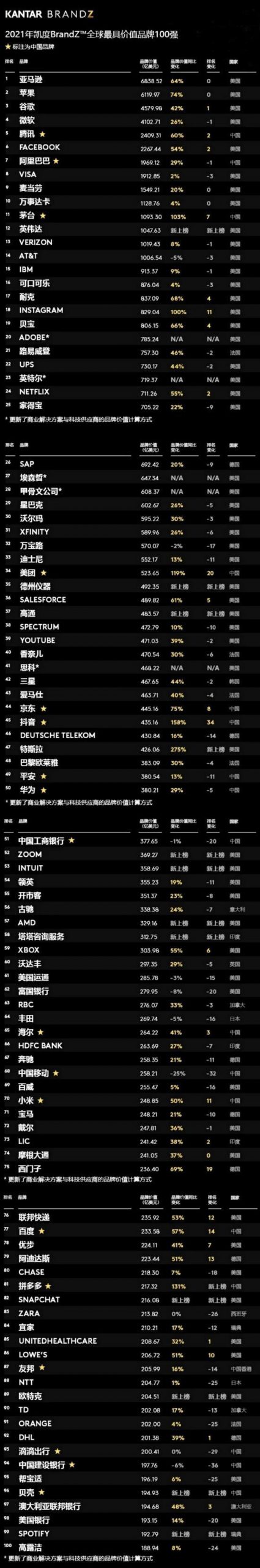 2021年凱度BrandZ最具價值全球品牌排行榜完整榜單