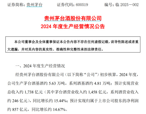 貴州茅臺(tái)預(yù)計(jì)實(shí)現(xiàn)營(yíng)業(yè)總收入約1738億元,同比增長(zhǎng)約15.44%;其中,茅臺(tái)酒營(yíng)業(yè)收入約1458億元,系列酒營(yíng)業(yè)收入約246億元。貴州茅臺(tái)預(yù)計(jì)實(shí)現(xiàn)歸屬于上市公司股東的凈利潤(rùn)約857億元,同比增長(zhǎng)約14.67%。貴州茅臺(tái)稱,上述數(shù)據(jù)為初步核算數(shù)據(jù),未經(jīng)會(huì)計(jì)師事務(wù)所審計(jì)。